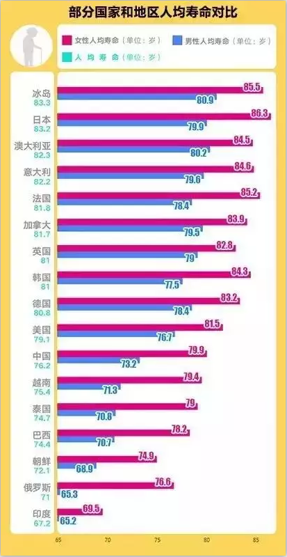 冰島憑借著男性80.9歲,女性85.5歲的人均壽命,摘得了冠軍;而同在亞洲的日本則摘得了第二名,男性79.9歲,女性86.3歲。值得注意的是,中國(guó)的人均壽命為男性73.2歲,女性79.9歲,比日本少7歲左右。